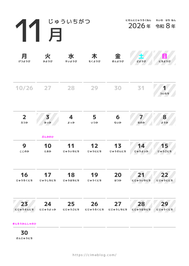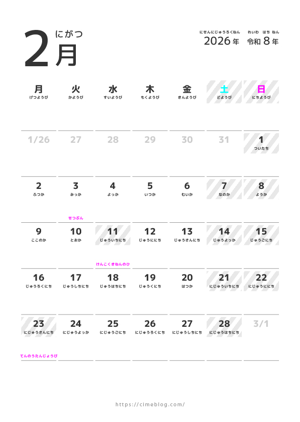 2026年こども用ひらがなカレンダーです。