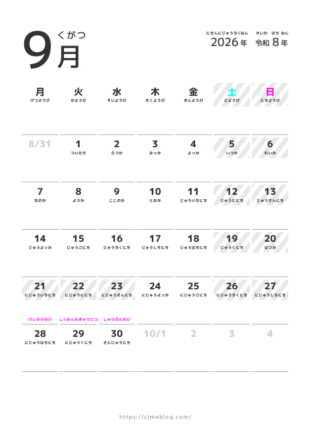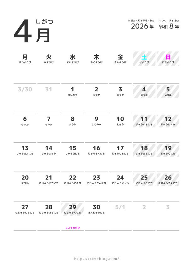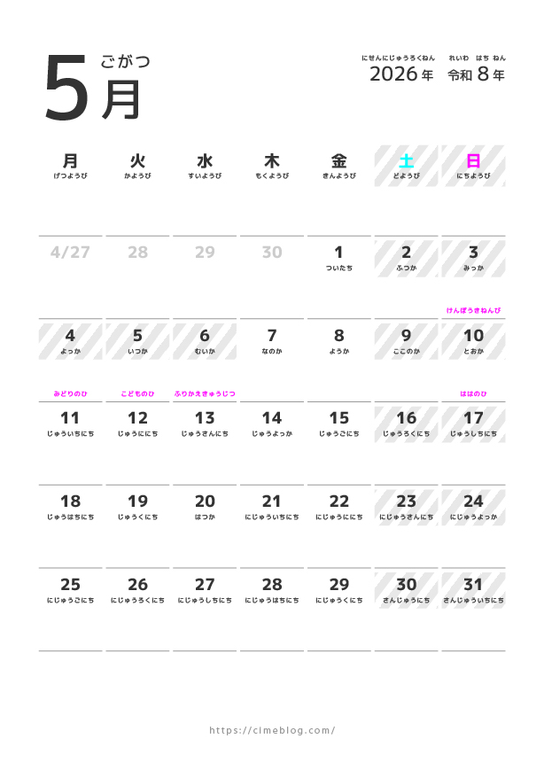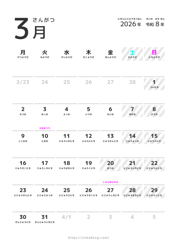 【無料ダウンロード】2026年こどもひらがなカレンダー:シンプルデザイン